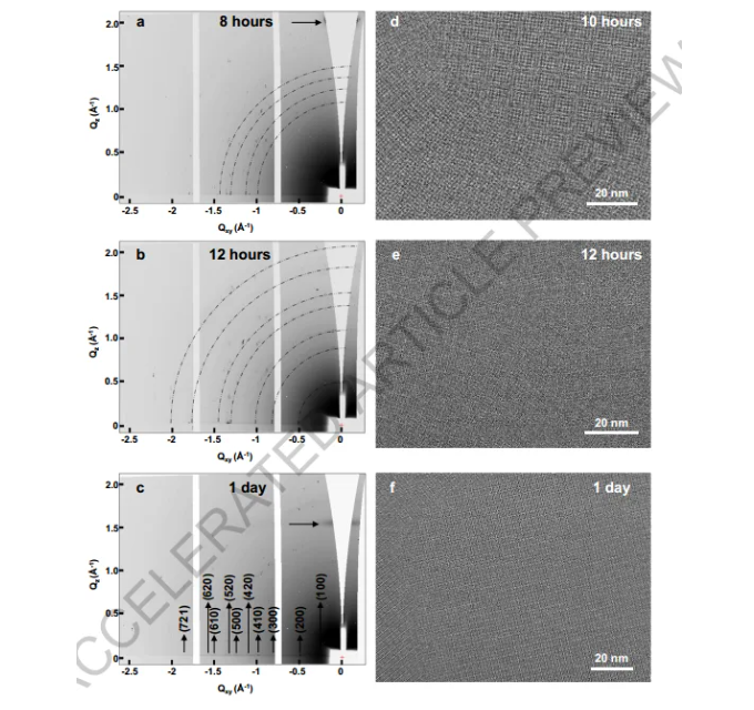 图3 | 2DCOF-1薄膜反应时间依赖性的GIWAXS图像。在合成时间为(a) 6443小时,(b) 7小时,(c) 16小时,(d) 6天的情况下,2DCOF-1薄膜沉积在直径为1.5 cm的硅块上的GIWAXS图像