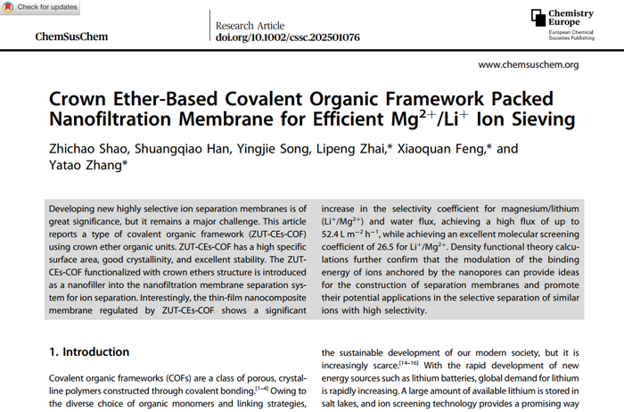 Crown Ether-Based Covalent Organic Framework Packed Nanofiltration Membrane for Efficient Mg²⁺/Li⁺ Ion Sieving