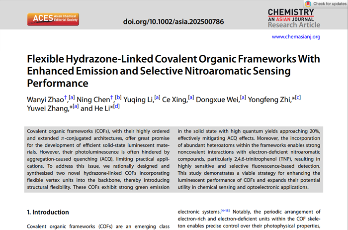 Flexible Hydrazone-Linked Covalent Organic Frameworks With Enhanced Emission and Selective Nitroaromatic Sensing Performance