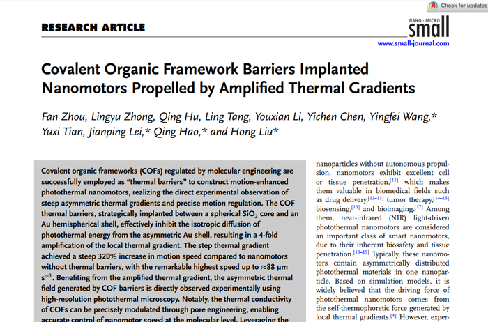 Covalent Organic Framework Barriers Implanted Nanomotors Propelled by Amplified Thermal Gradients